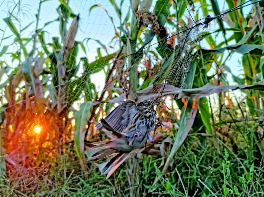 ▲2019年9月,记者在秦皇岛市卢龙县拍摄的捕鸟网上的鸟。 本报记者杜一方摄