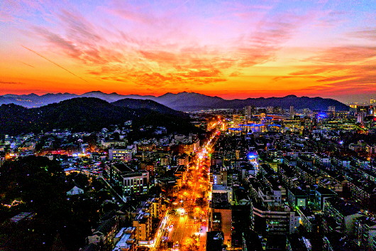 1月6日,杭州城区上空呈现绚丽晚霞(无人机照片)。