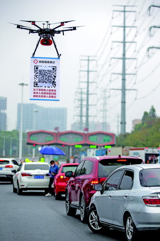 新华社深圳2月15日电(记者周科、毛思倩)“警方提示,入深人员请扫码登记……”11日,在G94高速深圳观澜收费站检疫点,一架悬挂有申报二维码的小型无人机低空慢行,一路漂移喊话,提醒司机进行入城申报。记者看到,排起长龙的车流中,车主纷纷摇下车窗,举起手机扫描。