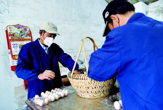 在诸暨市暨南街道新胜村经营农场养鸡的杨棚图因此获益,他农场里因疫情影响积压的五千多只鸡、十万多个鸡蛋,近日已全都卖出。 新华社记者韩传号摄