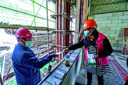 3月5日,清凉峰镇的党员志愿者(右)在颊口小学改扩建工地给工人送上口罩,普及并落实防疫举措。近期,浙江省杭州市临安区清凉峰镇积极做好服务企业、服务群众、服务基层工作,引导辖区内重点民生工程项目有序复工复产。当地政府成立由多部门党员志愿者组成的基层服务小分队,为各项民生工程做好上门服务,保障防疫物资及措施落实到位,积极保障基层民生工程安全有序复工。 新华社记者徐昱摄