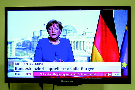 这是3月18日在德国柏林拍摄的德国总理默克尔发表讲话的电视转播画面。德国总理默克尔18日晚发表电视讲话说,新冠肺炎疫情是德国自二战以来遭遇的最大挑战,她呼吁民众严格遵守政府出台的限制性措施。 新华社记者单宇琦摄