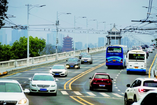 ▲3月25日拍摄的武汉长江大桥上的车辆。随着疫情防控形势好转,武汉正逐渐恢复“生活气息”。 新华社记者费茂华摄