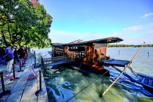 停靠在嘉兴南湖湖心岛的南湖红船(2020年10月27日摄)。