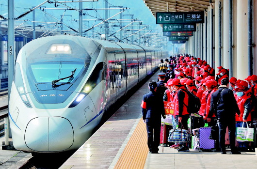 当日,500余名贵州省黔东南苗族侗族自治州锦屏县务工人员在三穗站搭乘2021年贵州首趟务工专列G2336次列车前往浙江义乌。