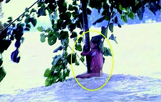 ![]() 1998年8月2日,洪水中抱在树上等待救援的江珊。 资料图片 |