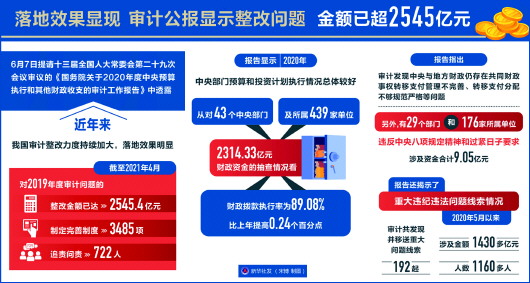 为及时反映最新整改情况,今年的审计报告首次将整改情况统计时段由上一年12月底延长至当年4月。根据报告,截至2021年4月,有关部门单位和地方对2019年度审计发现的问题已整改2545.4亿元,制定完善制度3485项,追责问责722人。