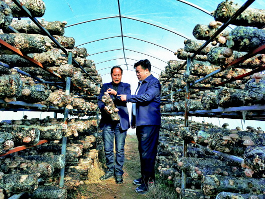 秦洁(右)在柳林村检查香菇生长的情况。 付炜摄 |