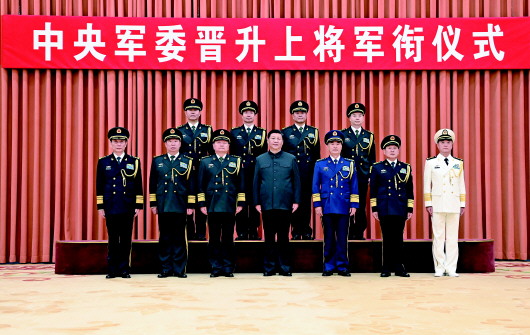晋衔仪式在嘹亮的军歌声中结束。随后,习近平等领导同志同晋升上将军衔的军官合影。