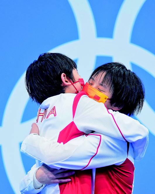 7月27日,中国选手陈芋汐(右)和张家齐在颁奖仪式上拥抱。 |