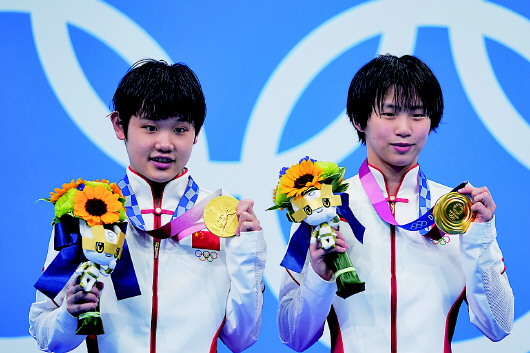 7月27日,中国选手陈芋汐(右)和张家齐在颁奖仪式上。 新华社记者许畅摄 |