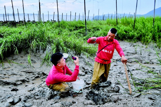8月13日,福建宁德市霞浦县沙江镇沙江村带货主播张序剑(左)在滩涂上拍摄父亲张应斌赶小海。 新华社记者姜克红摄 |