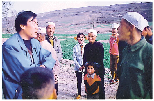 1995年4月,新华社记者张锦(左一)在调研西海固旱情时,来到泾源县大山深处的乡村采访,并与当地回汉族群众交谈。