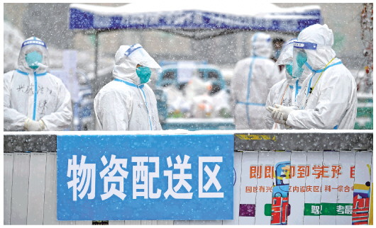 十一月六日,志愿者在宁夏银川市兴庆区一处中风险小区门前等候为小区居民转运生活物资。当日,银川市迎来降雪天气。当地战“疫”一线的工作人员坚守一线传递温暖。