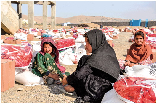 十一月九日,在阿富汗霍斯特省,孩子们坐在援助物资旁。联合国人道事务协调办公室九日称,援助机构在冬季到来前加大援助力度,帮助更多阿富汗人收到人道主义物资。 新华社发