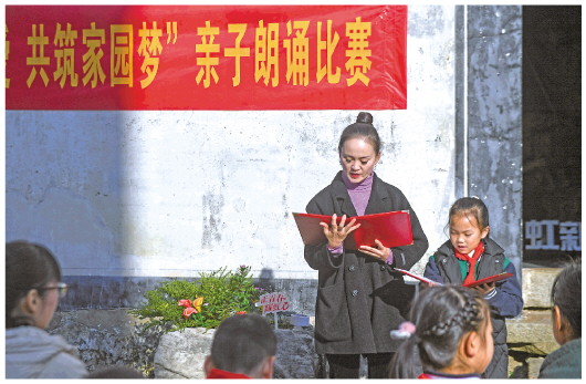 12月5日,一对母女在亲子朗诵比赛上朗诵好家风故事。当日,浙江省杭州市临安区高虹镇举行“传承红色基因 弘扬清廉家风”暨“小家传大爱 共筑家园梦”亲子朗诵比赛及参观活动,高虹小学的学生和家长一起参加了活动。