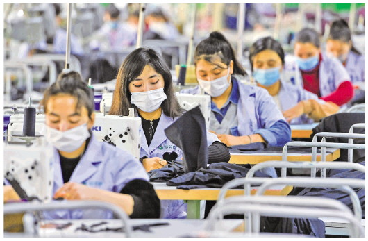 1月11日,在新疆墨玉县产城融合园,新疆耶莉娅服饰有限公司的员工在制作服装。近年来,墨玉县不断优化产业结构,打造以袜业全产业链、电子全产业链为主的产城融合园,有效促进当地经济发展,群众增收致富。