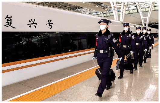 1月14日,女乘警们准备登上高铁列车。当日,由上海铁路公安处乘警支队5名女民警组成的女子乘警组亮相京沪高铁“复兴号”,开始执行列车值勤任务。