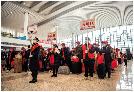 当日,在做好疫情防控工作的前提下,800余名返岗务工人员免费乘坐D1877次列车,从重庆西站出发,前往广东省返岗务工。这是重庆今年开行的首趟返岗务工人员复工专列。 新华社记者唐奕摄