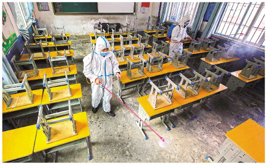 2月26日,在贵州省从江县刚边乡中心小学,工作人员在教室内消杀。