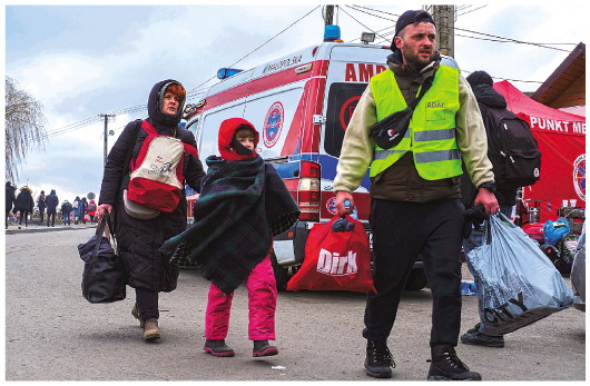 二月二十八日,一名志愿者陪同来自乌克兰的人们离开波兰梅迪卡口岸。 新华社记者孟鼎博摄