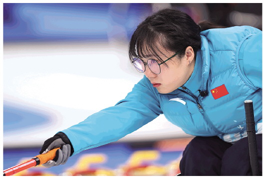 中国队选手闫卓在轮椅冰球循环赛中掷壶(3月7日摄)。