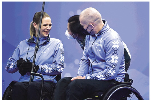 ▲爱沙尼亚队选手卡特琳·里德巴赫(左)在轮椅冰壶循环赛中与工作人员交流(3月6日摄)。