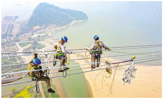 3月14日,在安徽芜湖的长江边,施工人员在高空进行特高压输电线路跨江作业。当日,白鹤滩—江苏±800千伏特高压直流输电工程安徽段跨越长江放线工程完成最后6根导线的展放,标志着特高压“白江线”安徽段长江大跨越线路贯通。