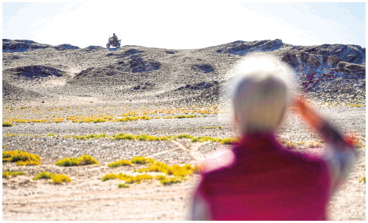 如今,尼玛76岁了。这一天,她步履蹒跚地为外出巡边的儿子哈达布和拿上望远镜、水壶,目送儿子骑上摩托车,消失在茫茫戈壁滩上。