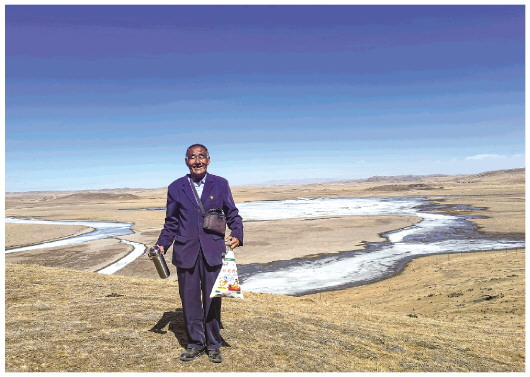 图为多杰老人和他身后的关秀湿地。 本报记者王浡摄