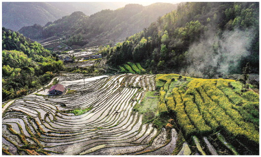 ▲在陕西安康市岚皋县南宫山镇桂花村,因春灌备耕,沿山势自上而下层层铺叠的千亩古梯田,仿佛戴上了一串串银链,构成了一幅优美的田园风光图(3月28日无人机照片)。