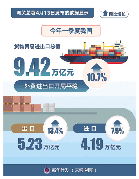 细读这份首季报:一般贸易进出口增长13.9%,占我国外贸进出口总值的63.2%;有进出口实绩的外贸企业数量同比增长5.7%;民营企业进出口增长14.1%,占比达到48%;我国对“一带一路”沿线国家进出口增长16.7%……