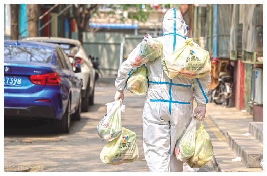 4月24日,朝阳区劲松街道社区工作者为封控区居民上门送物资。