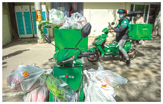 4月26日,在北京市朝阳区十里堡的叮咚买菜前置仓配送站外,一辆电动车上挂满了待送货物。 新华社记者陈钟昊摄 |