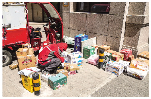 一辆“每日优鲜”骑手的二轮电动车上,后置配送箱里装满了货品,前面脚踏板的空间也被塞得满满当当。“已经送了20多单了,每单的东西也多了。”26日下午正在松榆东里南门送货的陈先生说。