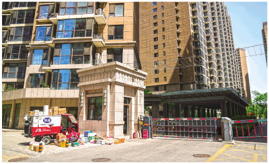记者发现栅栏边放置了几个大纸箱,写着“10、11、12楼快递放入此箱中”。社区工作者告诉记者,这三栋楼是封控楼,居民不能出户,志愿者会把快递统一送到楼下,再由穿着防护服的“大白”工作人员送货上门。
