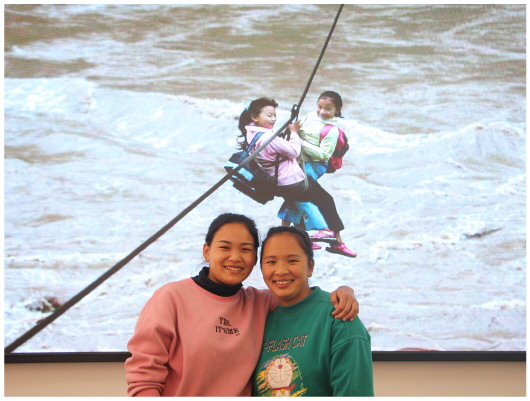 4月26日,余春花(左)和余才妹(右)一起重温姐妹俩当年过溜索时的照片。
