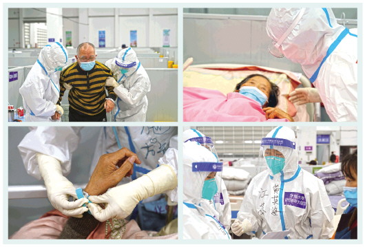 左下图:4月23日,上海临港方舱医院的医护人员帮助老年患者佩戴腕带。