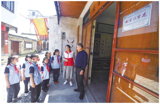 日前,河桥镇的纪检干部(右二)在河桥老街给河桥镇小学学生介绍一户好家风家庭的事迹。5月初,浙江省杭州市临安区河桥镇举行“传承古镇清廉家风”活动,河桥镇小学的学生和家长一起参加了包括书写清廉家风书法、听好家风故事等内容的活动。近年来,浙江省杭州市河桥镇积极组织青少年到河桥老街、镇史馆开展体验活动,传承传统文化,弘扬清廉家风。新华社记者徐昱摄