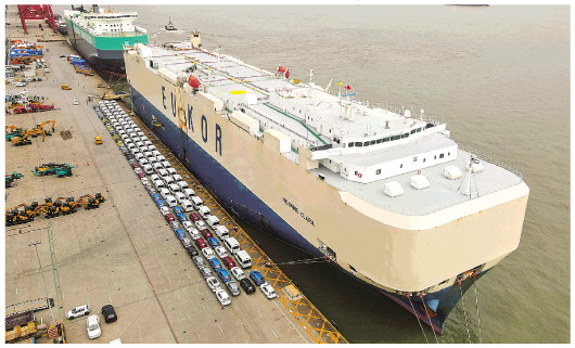 5月25日,在外高桥上海海通国际汽车码头,汽车滚装船“卡罗拉”号将在装载完包括1000多辆上汽集团自主品牌名爵和大通新车在内的3000多辆汽车后,出发前往澳大利亚。 新华社记者方喆摄