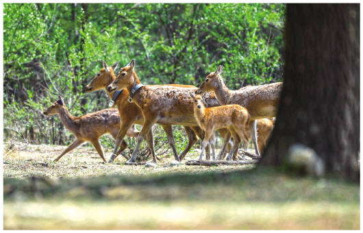 ▲5月23日,在内蒙古大青山国家级自然保护区,小麋鹿跟随麋鹿群活动。 新华社记者连振摄 |