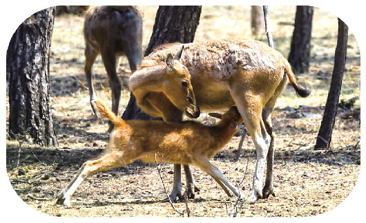 ▲5月23日,在内蒙古大青山国家级自然保护区,一只母麋鹿在喂养小麋鹿。