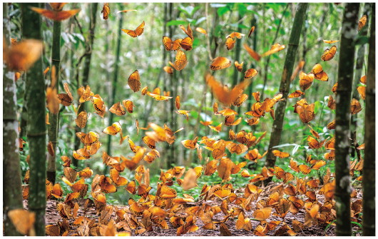 日前,云南金平中国·红河蝴蝶谷的蝴蝶已进入爆发期,预计今年蝴蝶爆发的总数可达1亿只以上。所谓“蝴蝶大爆发”,是指每年5月至6月,蝴蝶幼虫在短时间内大量集中羽化成蝶,在山林间、小溪边、山林小路上大量扎堆及漫天飞舞形成的景观。 新华社记者胡超摄
