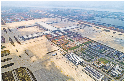 6月14日拍摄的鄂州花湖机场。近日,湖北鄂州花湖机场通过民航部门组织的第二批行业验收,即将投用。鄂州花湖机场建有2.3万平方米的货运站、67.8万平方米的分拣中心及2条3600米长、45米宽跑道,是我国首个专业货运机场。 新华社记者肖艺九摄