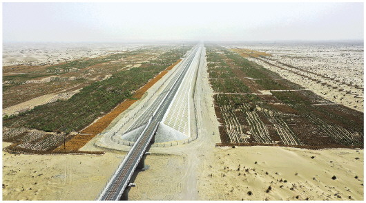 1000多个施工日夜里,建设者在和若铁路沿线共修建草方格近5000万平方米,种植梭梭、红柳、沙棘等灌木和乔木近1300万株,林带覆盖面积超过11万亩。这条长300公里的“绿色走廊”已成为防风沙的屏障。
