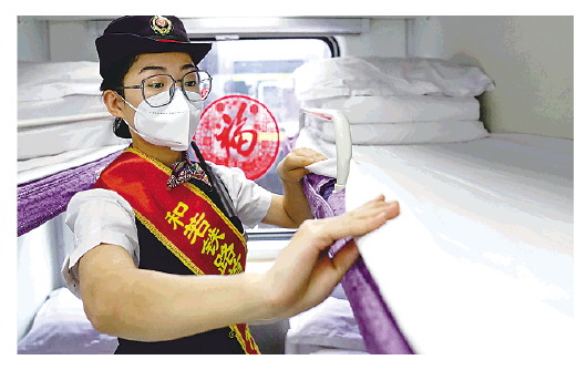 6月16日,在新疆和田火车站,和若铁路首趟列车的列车员在整理卧铺车厢。