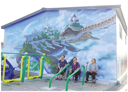 8月3日,北张村村民在墙绘艺术画前休憩。近日,山东省泰安市岱岳区道朗镇北张村新增的60余幅大型墙绘艺术画全部绘制完成,全村大型墙绘艺术画达100余幅。北张村从2018年开始将整治村庄环境与墙绘艺术画相结合,多彩墙绘成为该村特色,吸引不少游客前来观赏,推动了该村特色民宿和餐饮业的发展。 新华社记者徐速绘摄