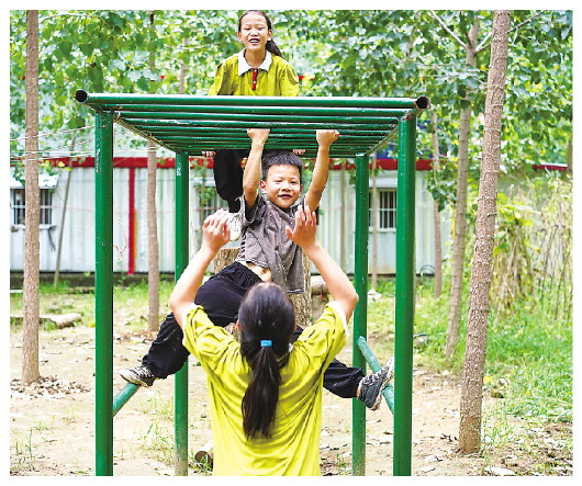 ▲刘龙的女儿刘亦婷、刘亦点(上),儿子刘亦行(中)在练武间隙玩耍(8月16日摄)。