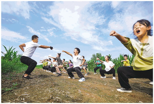 ▲刘龙带着孩子们练习武术(8月16日摄)。 新华社记者季春鹏摄