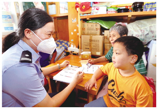▲8月25日,上海市公安局浦东分局潍坊新村派出所民警黄奕奕在泉东第二居民委员会的居民家中进行反诈骗宣传。上海浦东警方持续开展“百万警进千万家”活动,警务人员深入辖区开展入户走访,宣传反诈骗知识。 新华社记者凡军摄